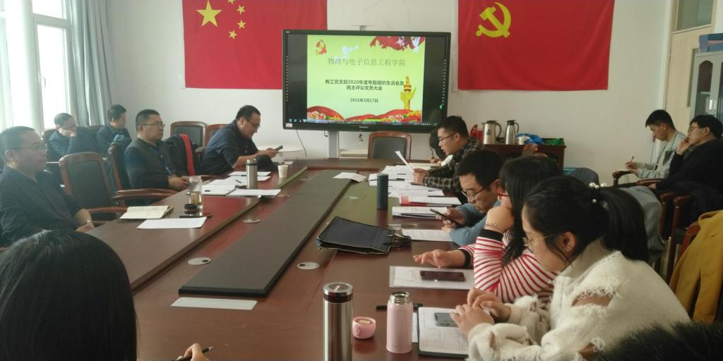 根据青师党组字[2021]6号文件精神要求,3月17日下午,新葡萄88833官网AMG教工党支部在城北校区西二楼学院会议室召开了2020年度组织生活会和民主评议党员大会,学院院长兼党总支副书记黄湘宁同志、党总支副书记王敬佩同志参会指导,会议由教工党支部书记康宇龙同志主持,教工支部全体党员参加了会议。