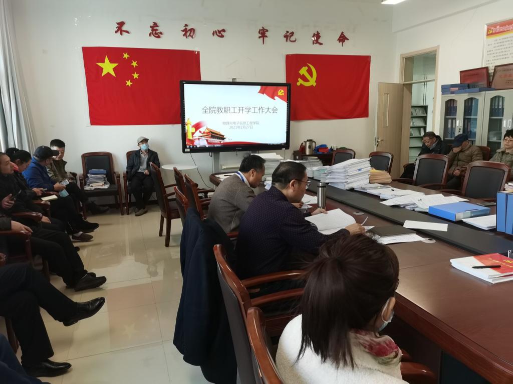为保障学院各项工作顺利开展,圆满完成2021年上半年度各项工作。2月27日上午,物电学院召开了全院教职工大会,安排部署新学期各项工作。会议由院党总支副书记王敬佩主持,院党总支副书记、常务副院长黄湘宁,院长助理王甲泰及学院全体教师参加会议。