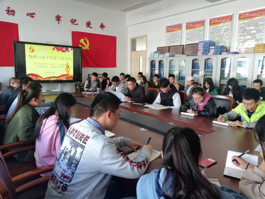2019年09月26日新葡萄88833官网AMG学生党支部在西二楼会议室召开了教育学习会,会议以“不忘初心,牢记使命”为主题。物电学院学生党支部副书记刘松、物电学院学生党员、预备党员以及发展对象参加本次会议,本次会议由刘松主持。